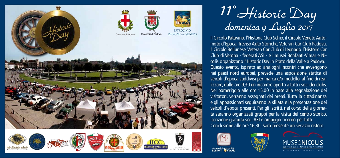 Undicesima edizione per l'Historic Day, evento che quest'anno si č tenuto in Prato della Valle a Padova, organizzato dal Circolo Patavino Auto Storiche in collaborazione con Historic Club Schio, CVAE Circolo Veneto, Circolo Bellunese, , Treviso Autostoriche, Historic Cars Club Verona, Veteran Car Club Legnago e Veteran Car Club Padova e con la partecipazione del Museo dell'Automobile Bonfanti - Vimar e del Museo Nicolis.